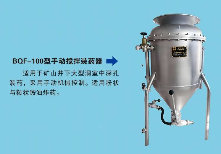 BQF-100型抬杠式有攪拌裝藥器,適用于礦山井下大型洞室中深孔裝藥,采用手動(dòng)機(jī)械控制。適用粉狀與粒狀銨* 油* 炸* 藥。